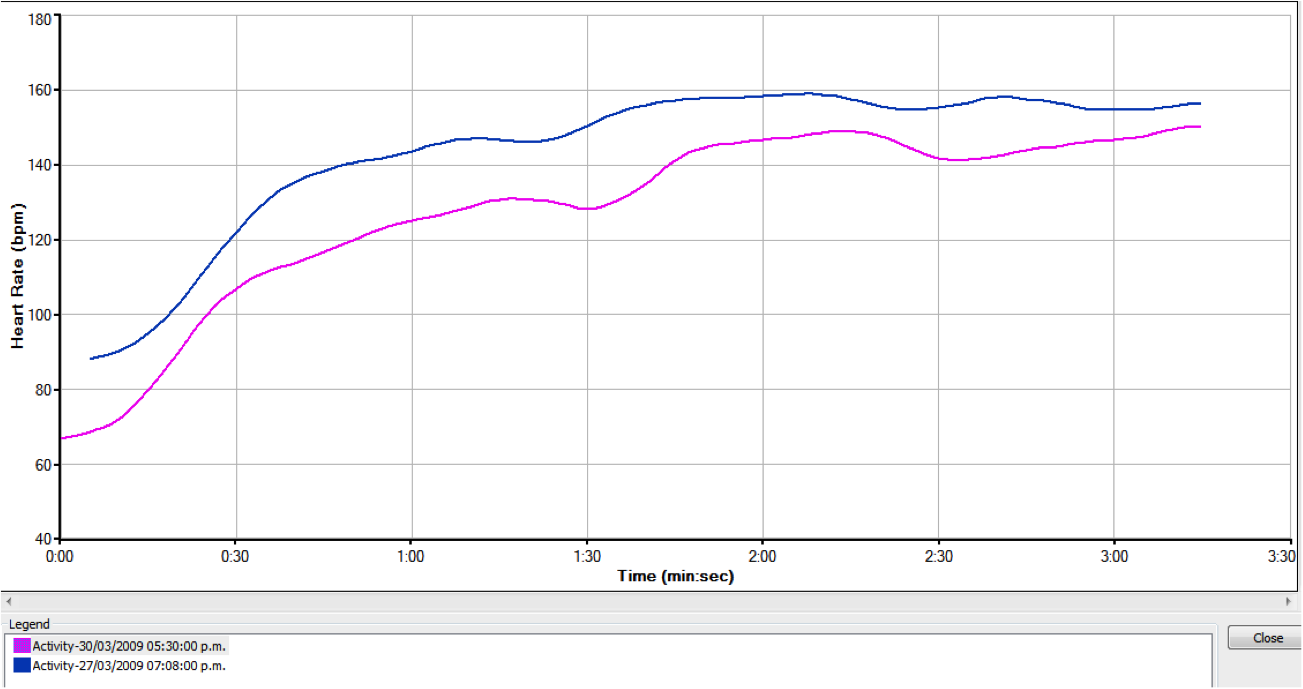 Un ejemplo de esto lo podemos ver en el siguiente gráfico de frecuencia cardiaca, donde un escalador realiza la misma ruta, en días distintos.