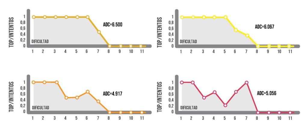 Estos perfiles graficados permiten determinar los recorridos que no desafían a los atletas, los que superan su capacidad y los que realmente desafían al deportista. Las primeras, son las completadas con facilidad y en un solo intento (obtienen una puntuación 1), las segundas cuando ya no se pueden realizar ningún progreso independientemente del numero de intentos (obtienen puntuación 0). Entre esos dos extremos se encuentra la zona donde el desafío es optimo para el deportista. Podemos ver en el siguiente gráfico la respuesta de cuatro diferentes atletas del estudio que llegaron al mismo nivel de intensidad de boulder.
