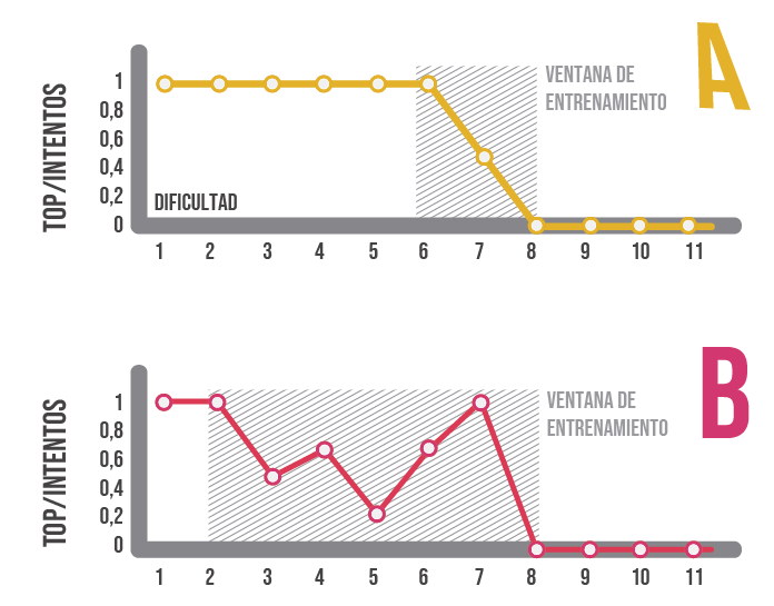 En la figura siguiente se pueden ver dos ejemplos, en donde los escaladores A y B a pesar de tener igual máximo alcanzado, su ventana de entrenamiento es muy diferente; el escalador A tiene una plasticidad alta, con una ventana de entrenamiento recomendada dentro de las altas dificultades, en cambio el escalador B tiene una ventana de entrenamiento recomendada mas amplia, incorporando recorridos de baja a alta intensidad. Generar estos perfiles individualizados de cómo se manejan las cargas puede llevar a encontrar la/s intensidad/es de entrenamiento adecuadas para cada individuo.