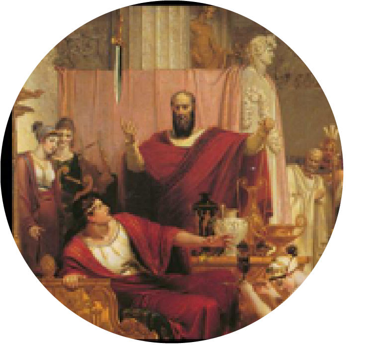 Dionisio fue el gobernante de la ciudad de Siracusa. El nombre de Dionisio recuerda al dios griego del vino y la juerga, y él estuvo a la altura del nombre. Aunque era rico y poderoso, era sumamente infeliz. Su forma de gobernar tan estricta le había generado muchos enemigos y estaba atormentado por el miedo a ser asesinado. Un día un adulador de la corte llamado Damocles lo elogió y comentó lo dichosa que debía ser su vida. En respuesta a eso, Dionisio lo invito a ocupar su lugar por un día, lo sentó en su dorado trono y ordenó a una multitud de sirvientes que le agasajaran. Se le mimó con suculentas carnes, licores, perfumes maravillosos y ungüentos. Damocles no podía creer su suerte, pero justo cuando empezaba a disfrutar de la vida de un rey, notó que Dionisio había colgado una espada afilada desde el techo, solo suspendida por un solo pelo de crin de caballo, apuntando a su cabeza. Después de lanzar varias miradas nerviosas a la hoja que colgaba sobre él, pidió ser excusado, diciendo que ya no deseaba ser tan afortunado.