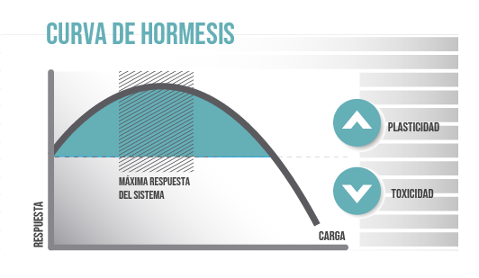 La capacidad de los sistemas biologicos de adaptarse y crecer a partir de los estresores del medio ambiente se denomina hormesis. Este concepto describe la relación bifásica entre la dosis de un estresor potencialmente danino y la respuesta que ese estresor desencadena en el organismo. Si la dosis es muy pequeña podría tener un efecto beneficioso en el corto plazo, y si la dosis es muy alta podría provocar el efecto opuesto. La clave de todo es encontrar el nivel optimo de estrés (carga) para provocar la respuestas esperadas.
