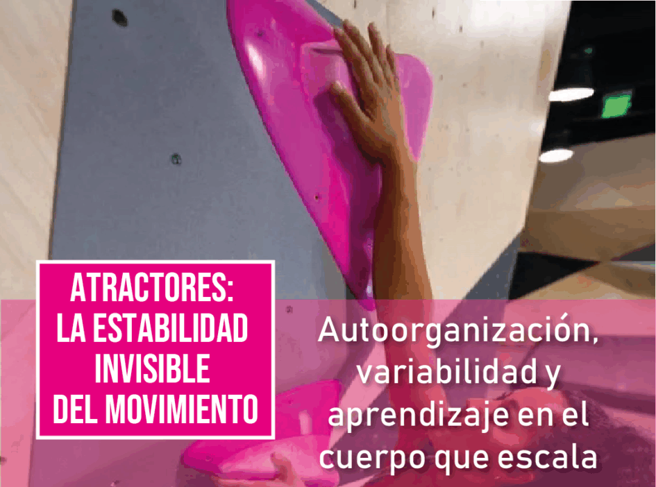 Cada vez que un escalador enfrenta una regleta, su cuerpo busca un patrón estable de coordinación como la posición del tronco, la tensión del antebrazo, la orientación del pie. Ese conjunto forma un atractor gestual. Si la presa cambia o el ángulo del muro se modifica, el cuerpo puede volver a ese mismo patrón o reorganizarse en otro. En las placas, por ejemplo, el atractor típico es la extensión del cuerpo y el peso sobre los pies; en los desplomes, la tendencia es agruparse, acercando el centro de masa al muro. Hay atractores posturales, hápticos, rítmicos, incluso emocionales. Todos conviven en un paisaje dinámico donde cada gesto es una búsqueda de equilibrio.