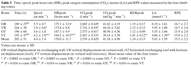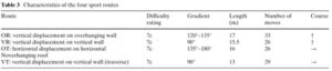 The average climbing time was 3 m 22 s 22s and climbers were longe on the vertical route with vertical displacement (VR) compared with the vertical traverse in vertical wall and with the vertical displacement in the overhanging wall. They found higher velocity of execution in overhanging routes (both, traverse and vertical displacement). Also the peak and average heart rate was higher in the vertical displacement route.
