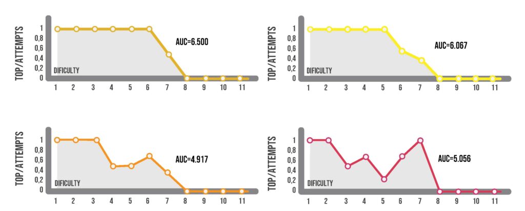 These graphical profiles allow to determine the routes that do not challenge athletes, those that exceed their capacity and those that really challenge the athlete. The first are those completed easily and in a single attempt (they obtain a score of 1), the latter when no progress can be made any more regardless of the number of attempts (they obtain a score of 0). Between these two extremes is the area where the challenge is optimal for the athlete. We can see in the following graph the response of four different athletes in the study who reached the same level of boulder intensity.