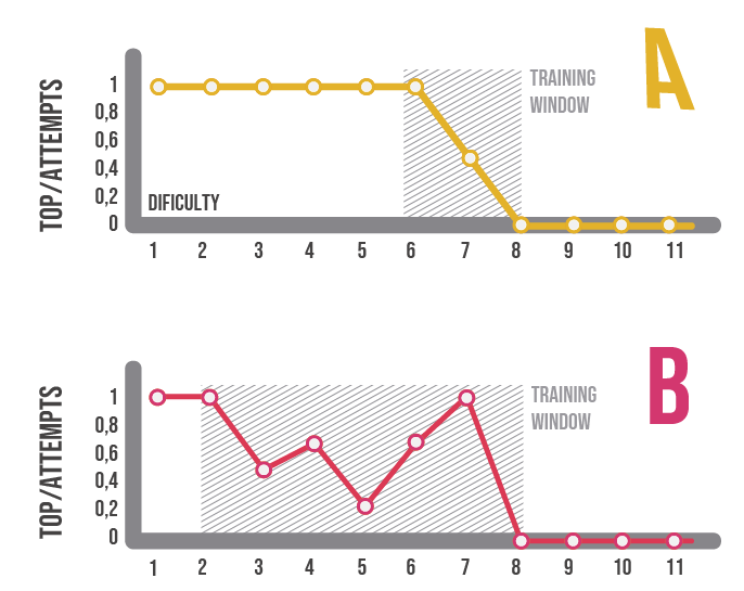 In the following figure you can see two examples, where climbers A and B, despite having the same maximum reached, their training window is very different; climber A has a high plasticity, with a recommended training window within high difficulties, while climber B has a wider recommended training window, incorporating low to high intensity routes. Generating these individualized profiles of how loads are handled can lead to finding the appropriate training intensities for each individual.
