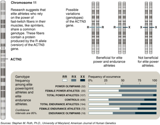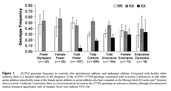 Yang, N., MacArthur, D. G., Gulbin, J. P., Hahn, A. G., Beggs, A. H., Easteal, S., & North, K. (2003). ACTN3 genotype is associated with human elite athletic performance. American journal of human genetics, 73(3), 627–631. https://doi.org/10.1086/377590