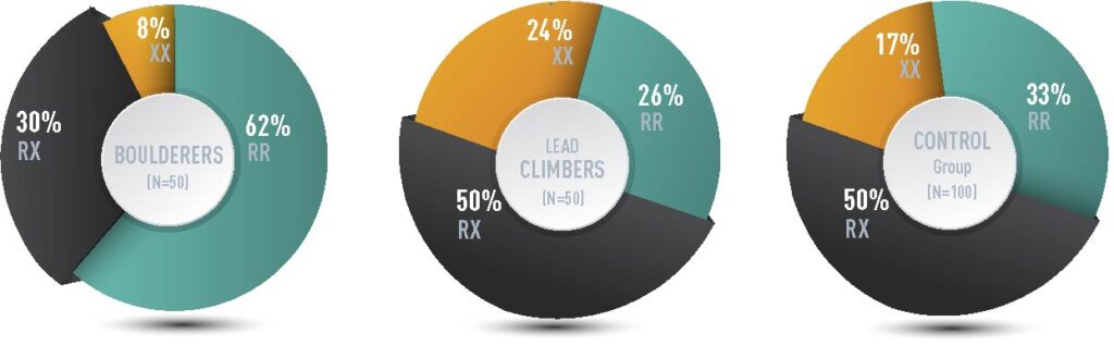 The frequency of the RR, RX and XX genotypes in the control group was: RR = 33%; RX = 50% and XX = 17%, while in climbers it was RR = 44%; RX = 40% and XX = 16% without having significant differences. But when we discriminate by discipline we see that there are significant differences, in the case of bouldering specialists the direction is as follows: RR = 62%; RX = 30% and XX = 8% and in lead specialists: RR = 26%; RX = 50% and XX = 24%.