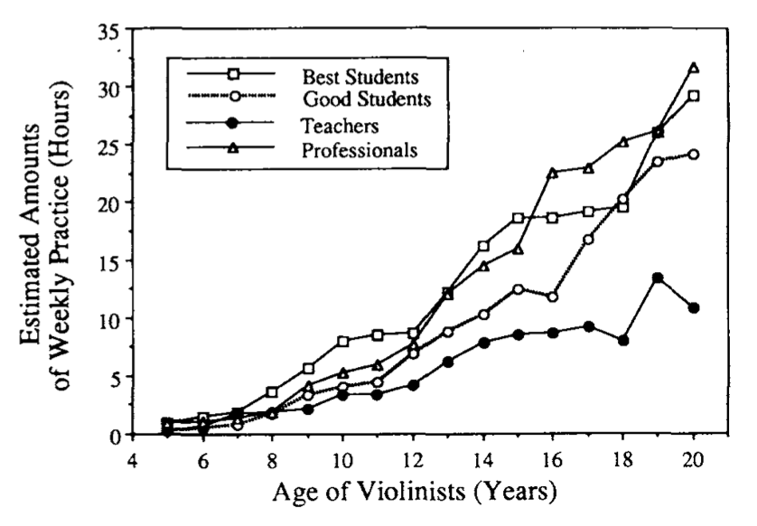 To check his theory, he studied violinists with different performances but their practice was with the characteristics described above. His findings led to what is now known as the 10,000 hour theory of practice. Senior violinists accumulated that many hours of deliberate practice throughout their careers, and as the rank of violinists decreased, so did the number of hours of practice. Through an extensive biographical interview, the weekly practice hours were estimated for each year since they began to play the instrument. To avoid influences that could confuse the data (especially working hours at the academy), the number of hours accumulated at the age of 18 was statistically analyzed. The best had accumulated 7410 hours of practice, while the average of the violinists considered good accumulated 5301 hours of practice. In their second study of the same article, they took it upon themselves to study young expert pianists with a group of amateur pianists.