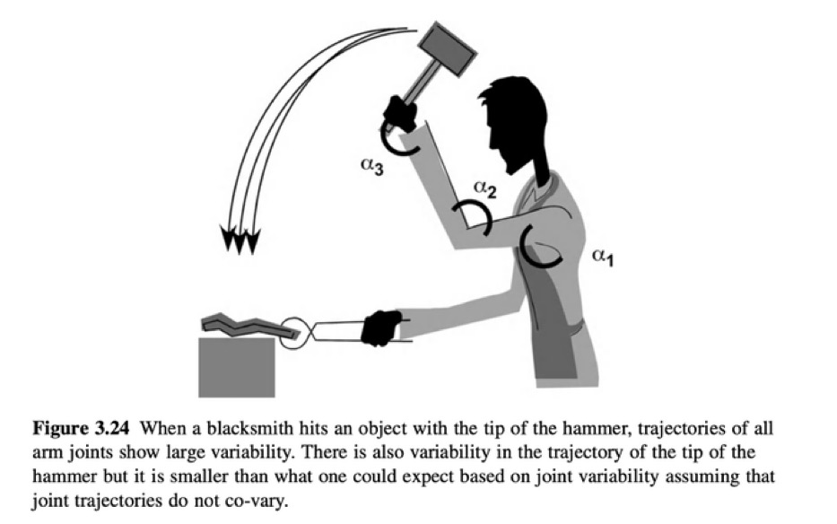 A classic Bernstein experiment consisted of analyzing through a high-speed photography system (a technology invented by him in the first decades of 1900) expert blacksmiths, who made blows with a hammer to an anvil thousands of times a day, 6 days a week for years, the best blacksmiths in Russia. They probably have the best technique with an optimal pattern to hit and develop that work. Bernstein inferred that replication of this hypothetical motor program would lead to a highly reproducible hammer trajectory, but nevertheless the trajectories of individual joints were constantly varied to accomplish the same task: for the hammer to strike accurately. If one joint deviated, apparently other joints compensated for the error, hence the famous phrase: repetition without repetition, that is, repetitive solutions of the task with variable means.