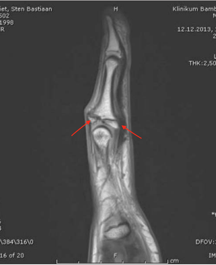 The increase in epiphyseal fractures of growing fingers in adolescents in Europe is worrying, as demonstrated by one of the latest published studies (Lutter et al, 2020). This speaks of a poor (lousy) adequacy of the means and methods of training in this population, which should undoubtedly also be transferred to other populations that are not so at risk of this type of fracture. The following image (MRI) shows permanent damage to the growth cartilage of the interphalangeal joint of a climber (Schoffl, I and Schoffl V., 2016).
