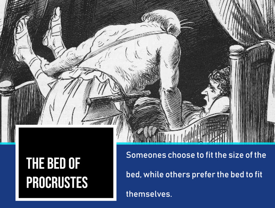 According to Greek mythology, in the hills of Attica, lived an innkeeper named Procrustes, son of Poseidon. In his inn he offered lodging to solitary travelers. Once fed, he invited them to sleep in an iron bed and while they slept, he tied them by the hands and foot to the four corners. If the traveler was taller and his body longer than the bed, he proceeded to saw the protruding parts: feet, hands and head. On the other side, if the body was smaller than the bed, it proceeded to stretch it with hammer blows (hence its name: stretcher). It is said that it had two beds, one bigger and one smaller …