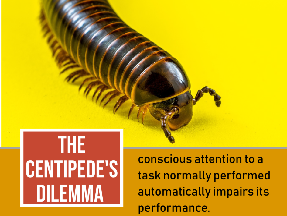 Who hasn’t experienced the same thing that happened to the centipede? When we start to consciously analyze a task, uncertainty wins the game. Even the simplest activities can become almost impossible. The centipede dilemma poem, attributed to Katherine Craster (1841–1874), was popularized by psychologist George Humphrey. In his book The Story of Man’s Mind (1923) he emphasizes that “No man skilled in a trade need pay constant attention to routine work, and if he does, the task will be spoiled.” Precisely Humphrey’s law says: conscious attention to a task normally carried out automatically impairs its performance.