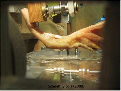 En otro estudio realizado por Schoffl y cols. (2009), también con manos cadavéricas, analizaron la influencia de estas dos posiciones en las poleas. Para ello se midieron las fuerzas en los tendones y la fuerza ejercida en la punta de los dedos de ambos agarres. Los autores concluyen que la ruptura de la polea A4 se dio en el 50% de los dedos testeados en arqueo y en ninguno con los dedos en extensión. Las fuerzas que soportaron los tendones (hasta la ruptura) fueron de 371N y 348N en la extensión y el arqueo respectivamente, mientras que esa misma tensión producía al nivel de la punta de los dedos 105N y 161N respectivamente, lo cual no fue una diferencia estadísticamente significativa, pero las fuerzas que actuaron sobre las poleas fueron mas del doble en el aruqeo (121N para la polea A2 y 103N para la A4 en la posición en extensión y 287N y 226N para el arqueo). Estas fuerzas que se duplican hacen que la posición de arqueo sea la principal causa de lesión y/o ruptura de las poleas.