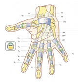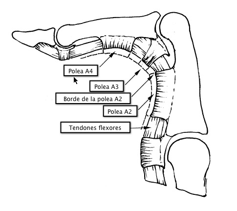 Los flexores de los dedos, el flexor común superficial (FCS) y el profundo (FCP) son los encargados de la flexión de los dedos (a excepción del pulgar). Dada la anatomía de la mano y que su inserción proximal está en el antebrazo, los tendones de estos músculos deben mantenerse unidos a los huesos para poder cruzar todas las articulaciones correspondientes y lograr cumplir su función. Para ello existen algunas correderas fibrosas que permiten que los tendones sigan su camino. En el dibujo siguiente extraído de Kapandji son las estructuras en azul. La primera de todas, en la zona de la muñeca, se denomina conducto carpiano, mientras que las siguientes y que ya están discriminadas para cada dedo se denominan poleas.