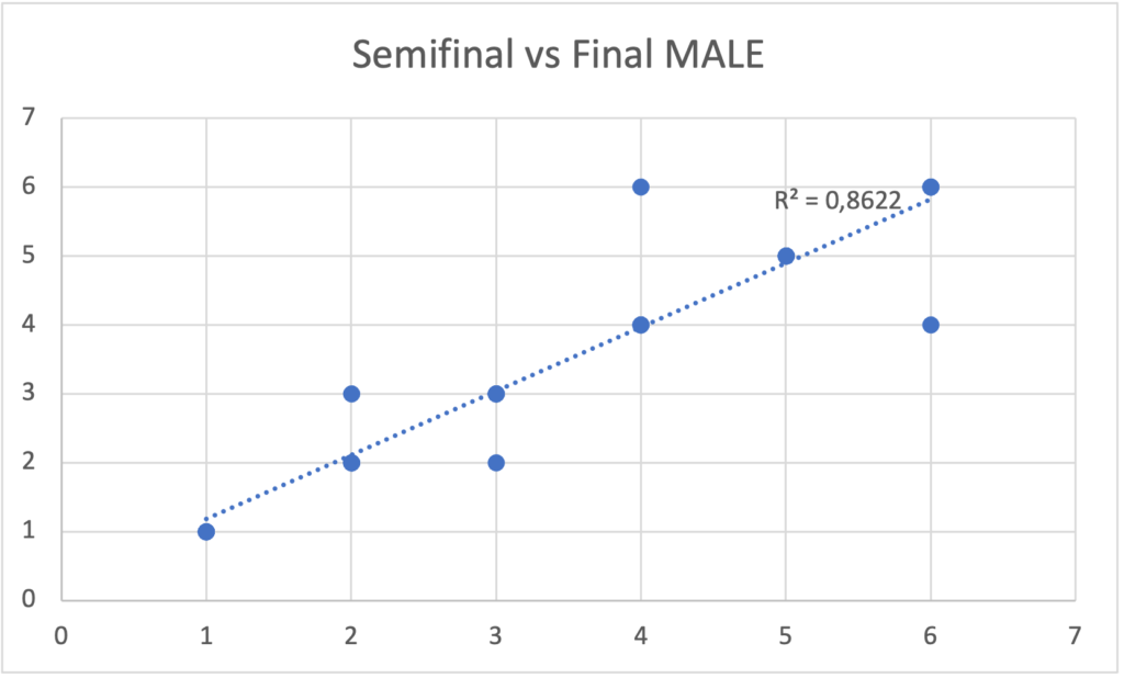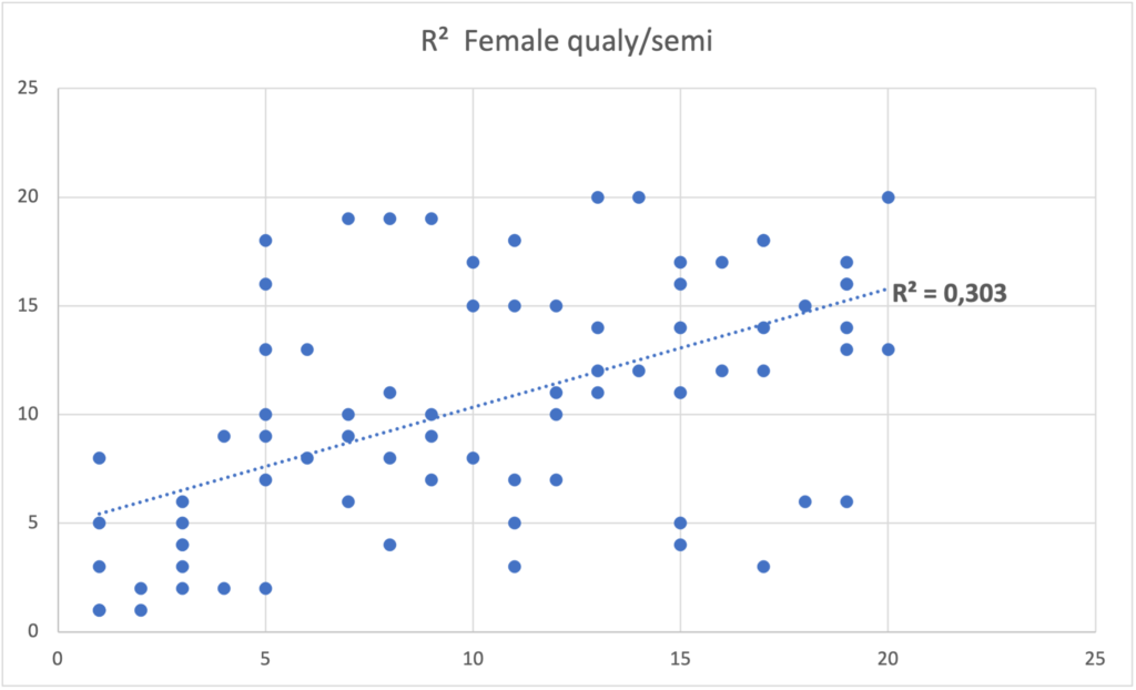 Pero cuando ampliamos este análisis a los resultados de la clasificación en relación a los de la semifinal los datos son bastante distintos, en el caso de los hombres, el R² es de 0,032 y el R² de las mujeres es de 0,30. Definitivamente la diferencia de niveles se hace muy notoria y existe una gran variabilidad en los resultados, casi con una correlación nula para los hombres.