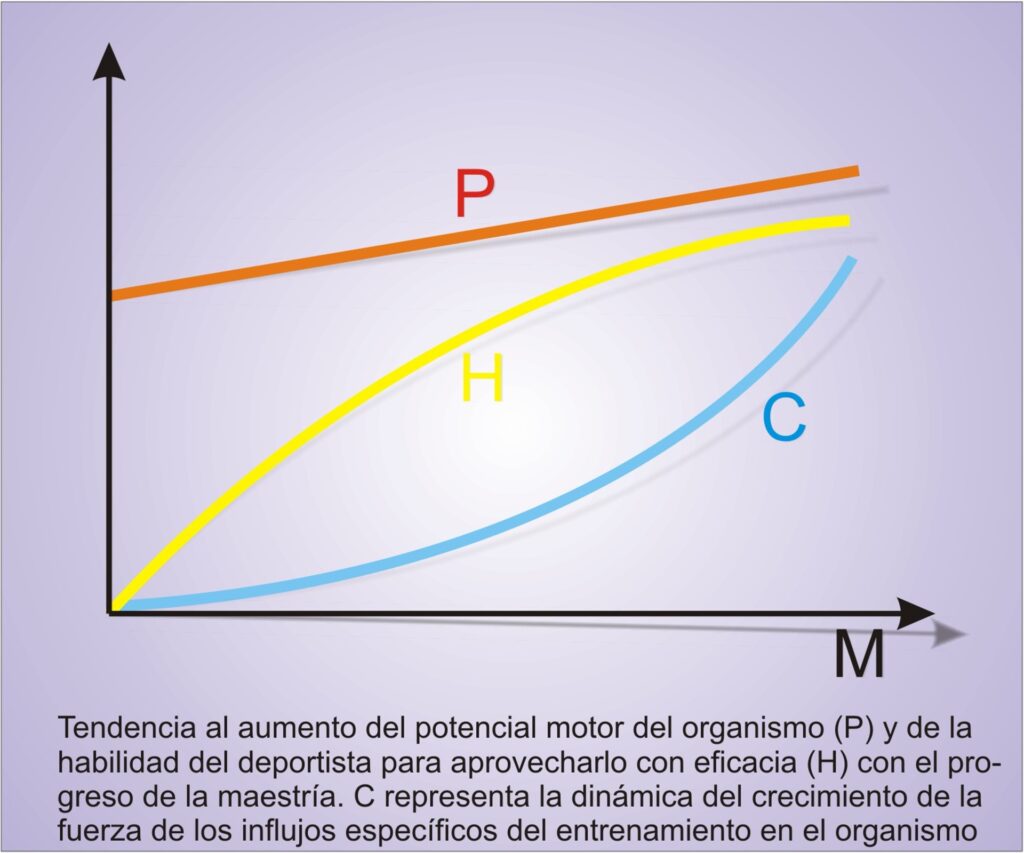 Más aun los estímulos deben ser cada vez más específicos e individuales haciendo imposible prácticamente el entrenamiento grupal. Según Y. Verkhoshansky (2002) el incremento de la maestría deportiva (M) depende principalmente de dos factores: el aumento del potencial motriz del deportista (P) y su habilidad para aprovechar de manera eficaz ese potencial de entrenamiento (H). A medida que aumenta la maestría (M) que se representa en el eje x , el deportista saca mayor partido de su capacidad de trabajo.