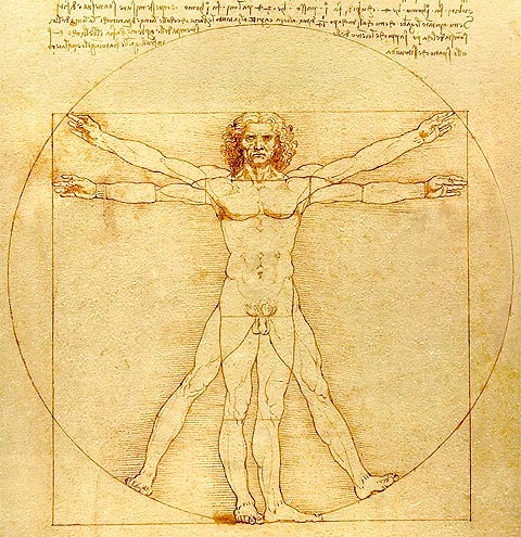 El cuadrado del ¨hombre de Vitruvio¨, está centrado en los genitales, y el círculo en el ombligo. La relación entre el lado del cuadrado y el radio del círculo es la razón áurea. Para Vitruvio el cuerpo humano está dividido en dos mitades por los órganos sexuales, mientras que el ombligo determina la sección áurea. En la Edad Media, la sección áurea era considerada de origen divino: se creía que encarnaba la perfección de la creación divina.