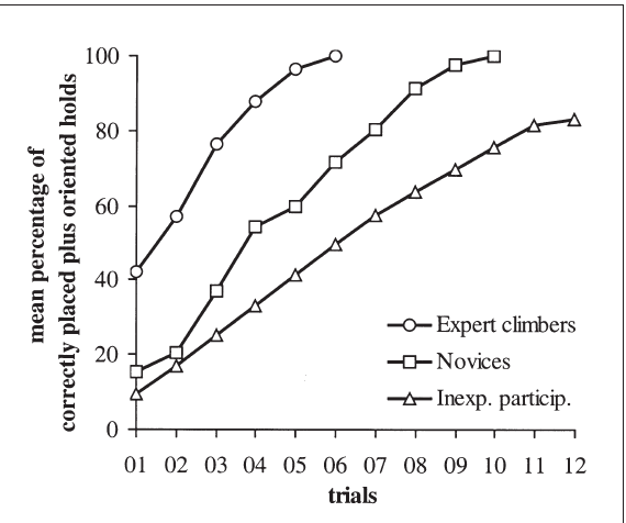Uno de los primeros estudios relacionados con la escalada lo realizaron Boschker y cols (2002), donde evaluaron las diferencias en la percepción entre escaladores expertos, de nivel inicial e inexpertos. En el primer experimento se les pidió que inspeccionaran una ruta durante 2,5 minutos de 23 presas y reproducir la posición y orientación de las mismas, y en los subsiguientes intentos tenían periodos de 5 segundos para observar y luego corregir las presas mal ubicadas u orientadas, en el gráfico podemos ver según los niveles el promedio de intentos en el que resolvieron la tarea. En un segundo experimento con un pequeño número de escaladores expertos y escaladores sin experiencia, se le pidió que en la memorización del recorrido piensen en voz alta, verbalizando todo lo que percibían. Cerca de un tercio de los reportes de los escaladores avanzados contenían declaraciones acerca de la estructura de las presas, mientras que mas de dos tercios contenían información acerca de las oportunidades de escalada de las presas, a diferencia de los inexpertos que casi la totalidad de las declaraciones solo estaban dedicadas a la estructura de las presas y no a su funcionalidad. De ambos test se deduce que los escaladores expertos son capaces de extraer más información del medio especifico de escalada, centrándose específicamente en los aspectos funcionales de las presas en comparación con los de nivel intermedio, y los inexpertos.