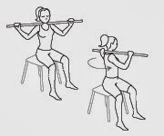 El escalador sentado en un banco, con las rodillas flexionadas a 90grados y un baston por detrás de la nuca sostenido por las manos, rota lo más que pueda.