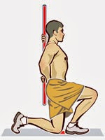 Con un bastón en la espalda sostenido con una mano cerca del cuello y la otra en la zona lumbar, se le pide al evaluado que realice una estocada con los pies mirando hacia adelante y en línea hasta que toque con la rodilla el suelo. De ahi retornar a la posicion inicial.