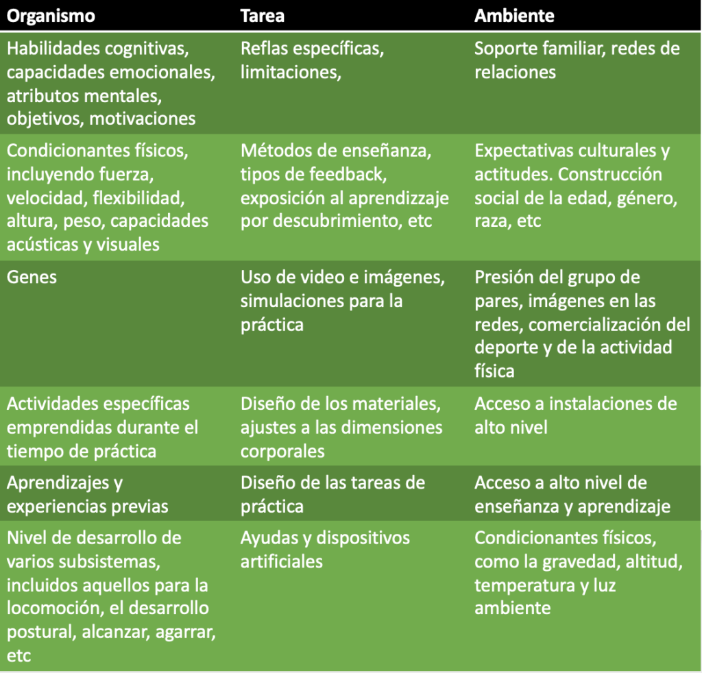 A la hora de construir una teoría válida para el rendimiento y perfeccionamiento deportivo se debe considerar las propiedades tanto del organismo como del medio ambiente. Desde esta perspectiva hay tres fuentes de condicionantes: el organismo, el medio ambiente y la tarea (Newell, 1996). El organismo tiene múltiples condicionantes estructurales y funcionales (bioquímicos, neuronales, anatómicos, etc.) al igual que el medio ambiente que tiene condicionantes generales (temperatura, presión, gravedad) y locales (por ejemplo, los implementos deportivos). Los condicionantes de la tarea incluyen el objetivo de la acción y las reglas que guían esa acción. Estas tres fuentes de condicionantes proveen un marco dinámico de limitaciones.